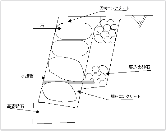 裏込め砕石には水の流れを予測して最適の転圧を加える。天端コンクリートはひび割れを防ぐ工夫として台形の形で打設。胴込めコンクリートは気泡の除去と上下の付着を考えます。